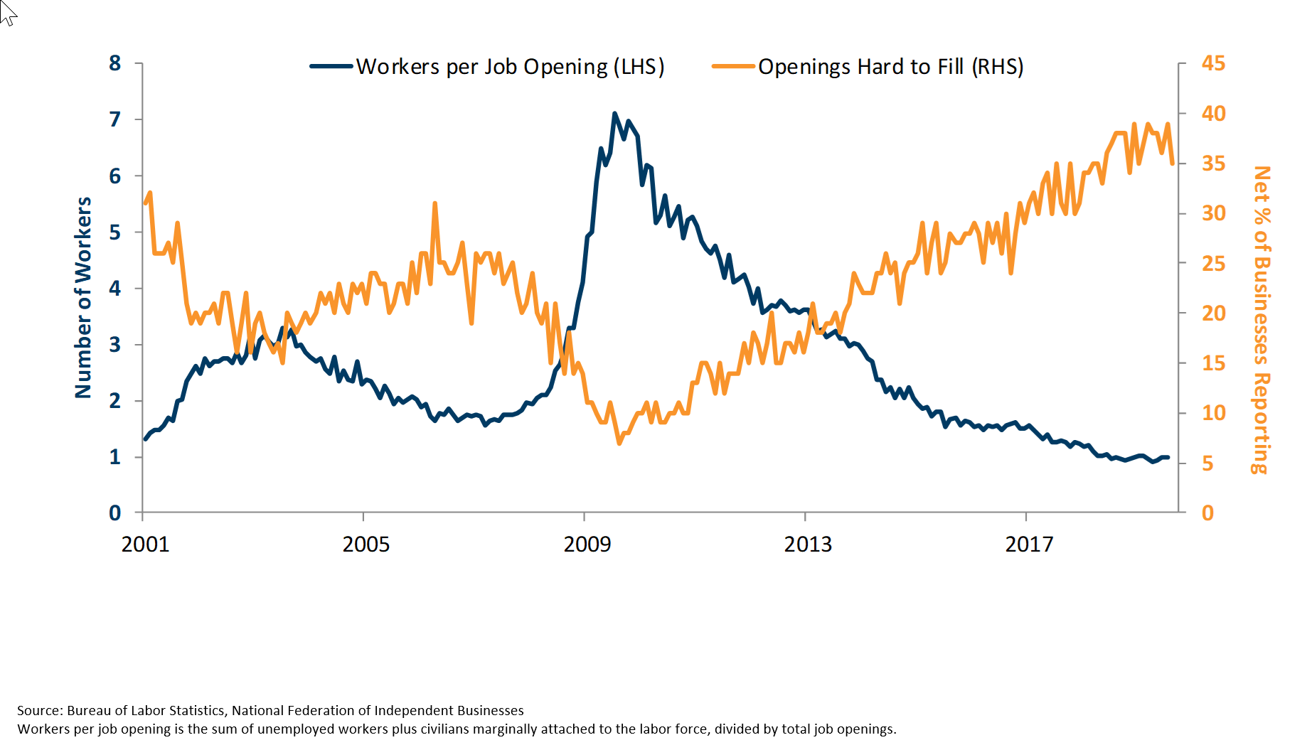 A number of data points suggest the U.S. economy is already under pressure, Friedman said. They include a tight labor market in which the number of workers available to fill job openings is at an all-time low, and declining corporate profit margins at a time when pricing power, thanks to sluggish economic conditions elsewhere around the world, is limited. This leaves corporations vulnerable to financial shocks, especially since businesses are, on average, highly leveraged. U.S. nonfinancial corporate debt equals nearly half the nation’s gross domestic product at the moment, higher than it’s been at any time since at least the 1950s, including immediately prior to the 2000 and 2008 recessions.