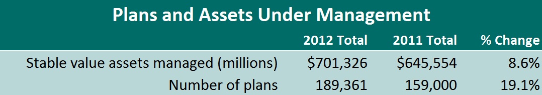 SVIA’s Annual Stable Value Investment and Policy Survey, its most comprehensive survey, confirmed the positive trends found in most defined contribution plan asset allocation and stable value investments surveys. The annual survey, which covers 38 stable value managers, reported that assets under management in 2012 had risen to $701 billion, which is up by 8.6 percent from 2011. Further, the annual survey found this increase was experienced by all three management segments: individually managed accounts, which generally cover large plans, grew by 2.9 percent, pooled funds, which generally cover small to mid-sized plans, grew by 0.8 percent, and life insurance company accounts, which cover all-sized plans with their product offerings, grew by 17 percent. Based on the annual survey, stable value comprised 14 percent of all defined contribution plan assets in 2012.