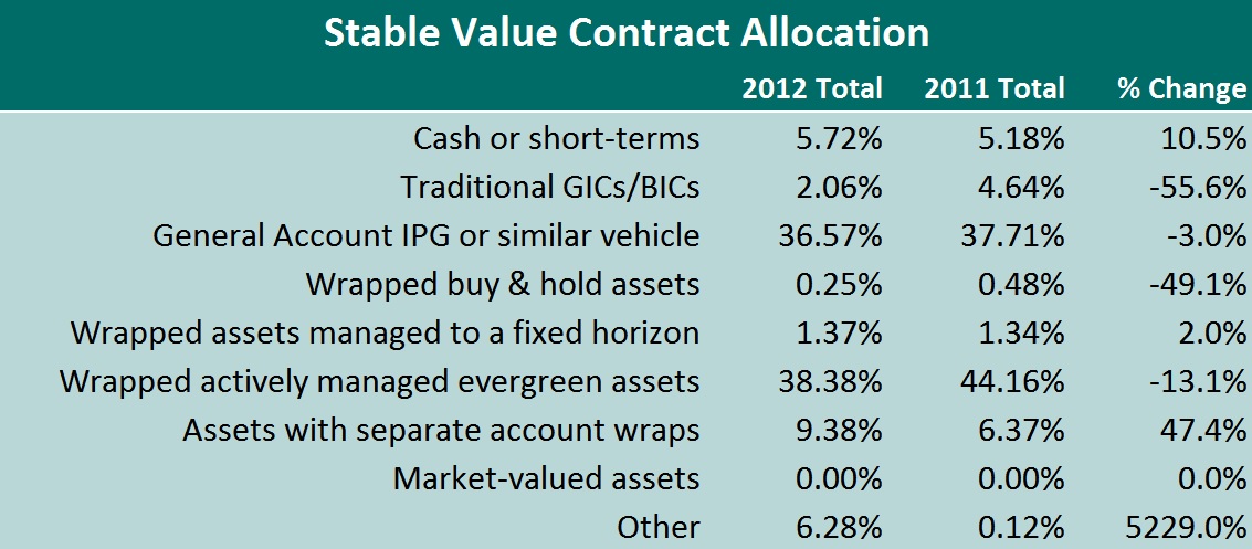 The annual survey found that the underlying portfolio allocation continued to vary based on the management segment. Overall the annual survey found that the average allocation in 2012 for stable value products was 5.7 percent in cash, 38.6 percent in GICs and general account products, as well as 49.4 percent in wrapped assets.