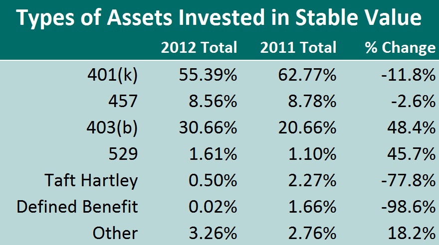 Plan assets in the survey were predominantly defined contribution plan assets with 401(k) at 55 percent, 457 plans at 8 percent, and 403(b) at 31 percent in 2012. The remaining 5.4 percent was comprised of other tax-deferred savings plans such as 529 tuition assistance plans, Taft-Hartley plans and defined contribution plans. Interestingly, 403(b) plans increased and 401(k) plans declined when compared to 2011 data. This can be attributed to the strong growth of the life insurance company accounts management sector as well as survey participation, since survey participants can vary from year to year.