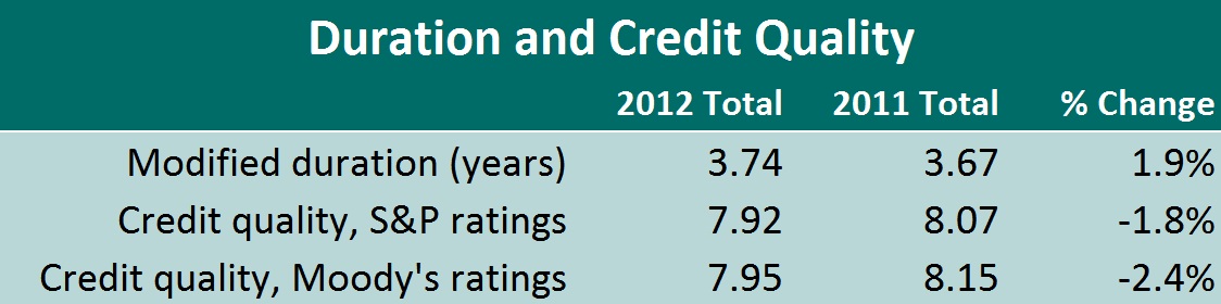 The annual survey reported similar trends as SVIA’s Quarterly Characteristics Survey with respect to some metrics, but not all. The annual survey found that the credit quality of the underlying investments decreased overall with survey participants reporting AA or Aa2 or better on average using both S&P and Moody ratings, whereas the quarterly survey shows credit quality edging upwards towards AA+ or Aa1. The annual survey also found that duration had increased from 3.74 years in 2012 from 3.67 in 2011, and the quarterly survey reported a similar trend. The variations can be attributed to the fact that the annual survey covers both a larger and broader array of stable value products, whereas the quarterly survey covers 23 synthetic GIC stable value managers.